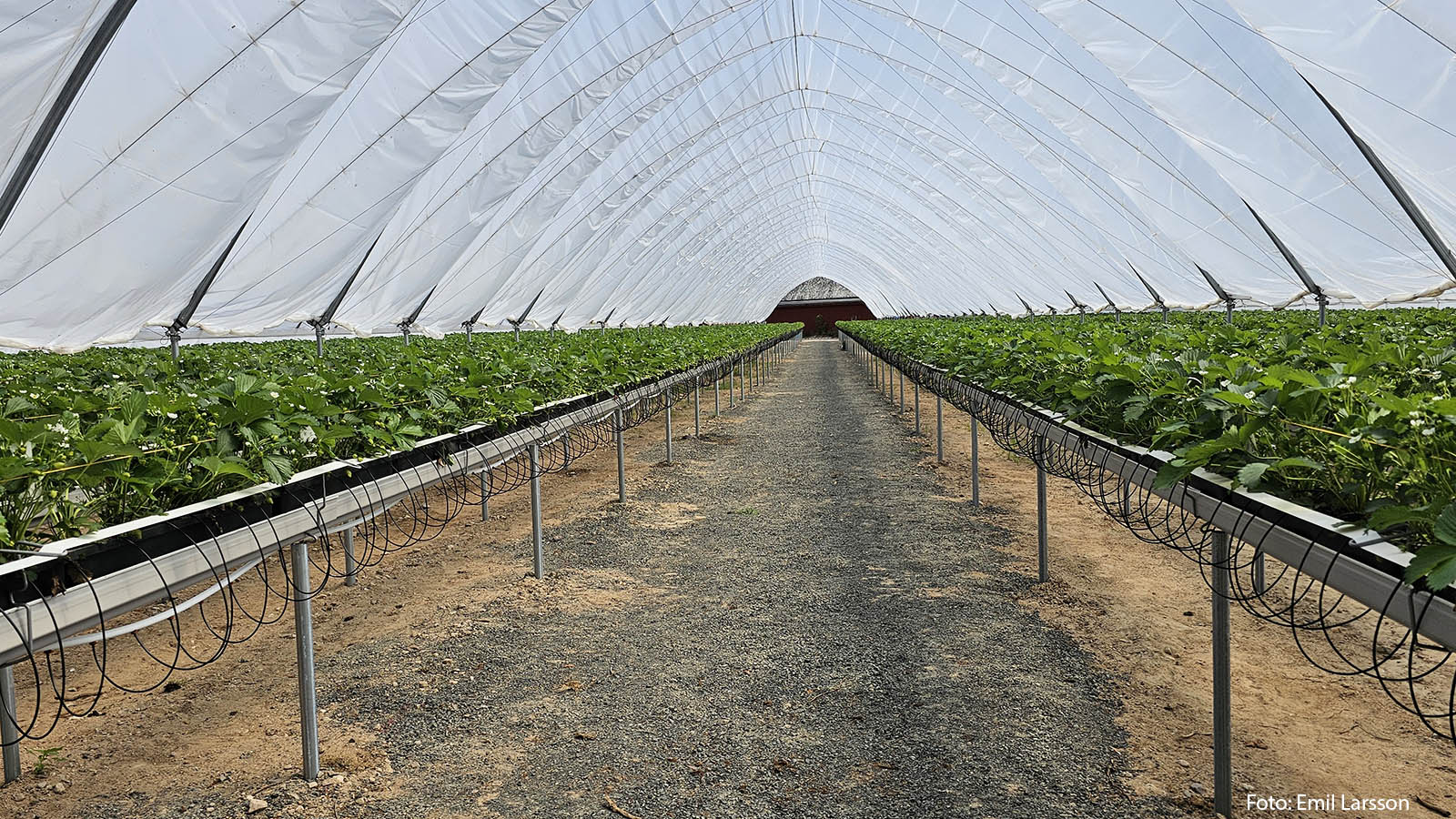 När Emil Larsson tog över familjegården i skånska Verum för åtta år sedan ville han utveckla verksamheten i en ny riktning. Som yrkesverksam inom styrsystem för bevattning i växthus såg han möjligheten att kombinera lantbrukets traditioner med effektiv teknik. På platsen där det tidigare fanns en grisåker står nu fyra stora multitunnlar fyllda med rader av jordgubbsplantor, cirka en meter ovan mark, så kallad table top-odling.